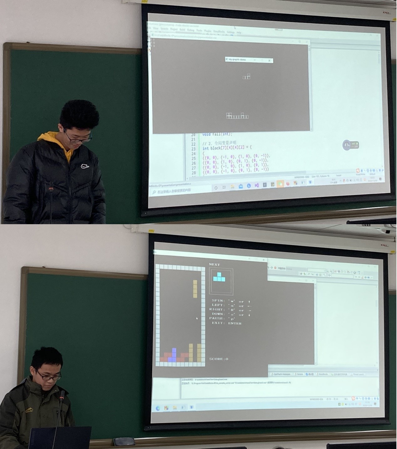 2020级的学生们克服从未编过程序的心理障碍,演示了自己设计的俄罗斯方块小游戏,并对游戏的设计思路、内部逻辑关系、开发过程中的困难进行了汇报展示。老师们认真听取了学生的精彩汇报,并为每个展示学生进行了进一步的指导。